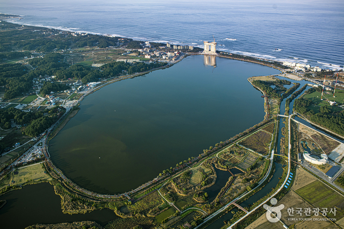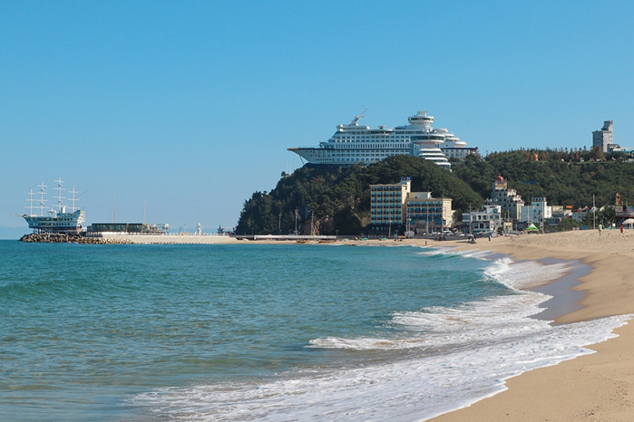넓고 이용하기 쉬운 곳은 정동진역 앞의 해변과 모래시계공원 앞의 바다이다.